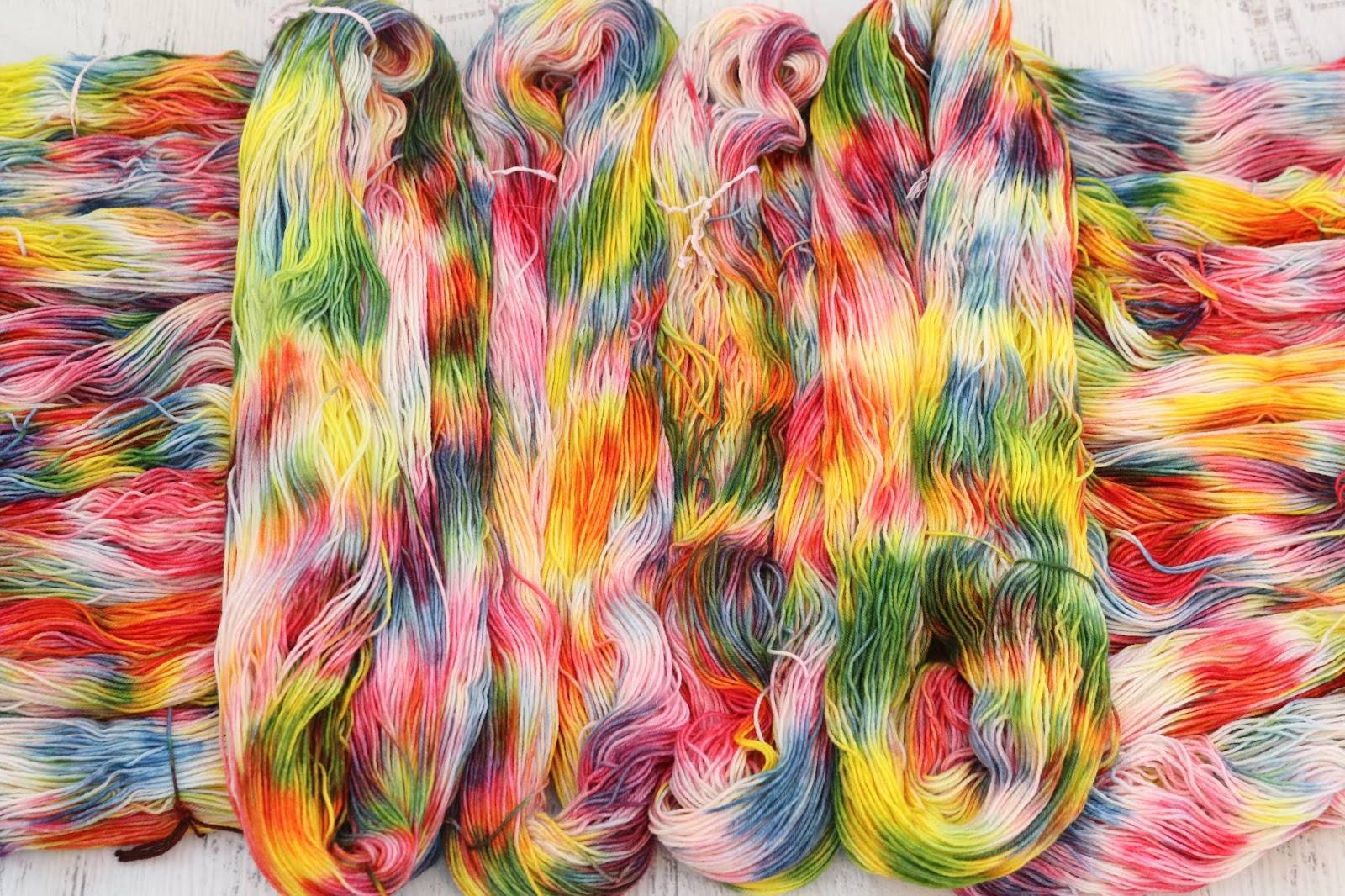 A variegated yarn is usually dyed with multiple colors in one skein with a very random pattern.